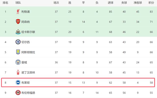 本轮拿到3分之后,布莱顿反超布伦特福德,排名升上第8位。最后一轮比赛,布莱顿将做客对阵热刺,如果能拿到1分,他们就将锁定第8,在极端情况下,布莱顿有机会参加欧战。届时只要切尔西在欧会杯夺冠(决赛对贝蒂斯),并且英超不进前五(切尔西进前五,欧会杯冠军获得的欧联杯席位将作废),那英超排名第8的球队,就将获得一个欧会杯席位。